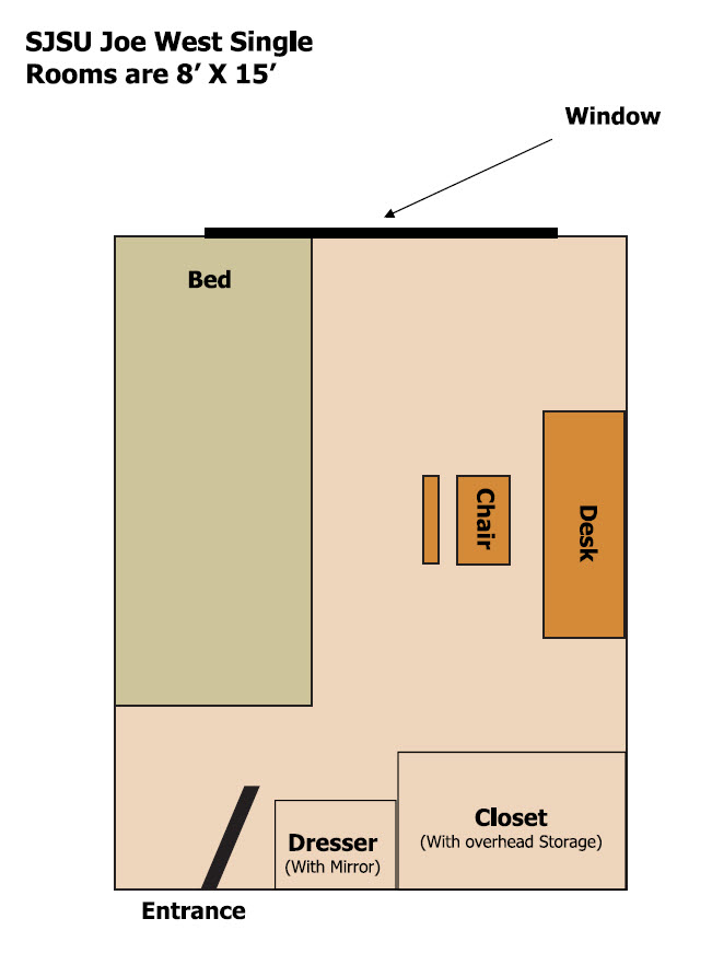 Double occupancy rooms are furnished with two of each of the following: extra long twin beds, desks, chairs, dressers, bookshelves, and closets. Triple rooms are furnished with three of each of the above (only two closets and bookshelves). Each room includes one towel rack, wastebasket, and paper recycling bin. Floors are carpeted, and windows are furnished with drapes.